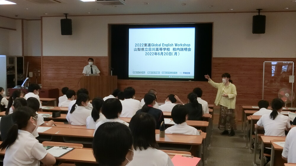 山梨県立日川高等学校 > 国際交流 > 国際交流説明会 2022年6月28日カテゴリー: 国際交流 国際交流説明会 6月20日(月)、本校視聴覚室で、「令和4年度国際交流説明会」が行われました。新型コロナウイルスの感染拡大でしばらく海外との直接交流が実施されていませんが、本年度は3月に英国語学研修の実施を予定しています。1年生45人が参加して、英国語学研修、KLB校生の受け入れ、イングリッシュデイなどについて説明が行われました。 また、東進のGlobal English Workshopについても外部から担当者が来校し説明をしていただきました。