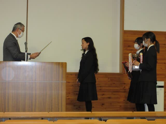 12月6日(水)納め式・壮行会を視聴覚室よりリモート配信にて行いました。 *納め式 ・文化部 ★第44回 山梨県高等学校芸術文化祭 【合唱部門】優秀賞 ・日川高校 【吹奏楽部門】優秀賞 ・日川高校 【書道部門】 芸術文化祭賞 ・久保 七海 【テーマ揮毫部門】奨励賞 ・降矢 樹和 【写真部門】 奨励賞 ・笠井 愛夢 ・堀内 陽菜 【社会科学部門】 奨励賞 ・内田 幸太郎 ・小林 由季 ・田口 諒真 ・野澤 輝 ・深沢 想万里 【テーマ部門】 奨励賞 ・西川 結唯 【自然科学部門】 *芸術文化祭賞 地学部門 第1位 「虹~副虹と虹予報について~」 日川高校 物理・地学部 ・竹井 白蓮 ・辻 翔太 ・山下 千晶 *理科部会特別賞 物理部門 第3位 「ハウリングを用いた距離測定の試み」 SSH物理班 ・南 陽斗 ・保坂 凰太 ・土屋 泰一 ・廣瀬 拓也 ・ 加藤 聡一郎 *理科部会特別賞 地学部門 第3位「山梨県甲州市勝沼町に位置する3つの扇状地の特徴」 SSH地学班 ・木内 康詠 ・仲澤・瑠音 ・竹居 白蓮 ・岡田悠希 ・前川 獅子王 *優良賞「登校時の信号待ちをゼロに」 SSH数学班 ・斉田 玲音 ・杉山 友哉 *優良賞「山梨市から見える空はどこまで広がっているのか」 物理・地学部 ・廣瀬 拓也 ・田口 諒真 *優良賞「日川高校グラウンドにおける黄色ブドウ球菌の研究」 物理・地学部 ・仲澤 瑠音 ・丹澤 菜月 *教育長奨励賞(化学部門2位)「桃の花の色素を用いた色鉛筆づくり」 SSH化学班 ・荻原 実里 ・石原 あゆみ *優良賞「身近な物質の燃焼効率について」 SSH化学班 ・望月 煌生 ・渡邉 駿 *優良賞「桃の葉の抗菌作用について」 SSH生物班 ・丹澤 菜月 ・廣瀬 拓也 ・鈴木 理世 ★第67回日本学生科学賞山梨県審査会 知事賞 「山梨県甲州市勝沼町における『甲州』圃場の土壌調査」 日川高校 SSH地学班 ・橋本 勇太 ・中村 優斗 ・坂野 寛弥 ・木内 康詠 ・仲澤瑠音 ・竹居 白蓮 ・岡田 悠希 ・前川 獅子王 第28回西関東吹奏楽コンクール高等学校部門Aの部 銅賞 日川高校 第78回関東合唱コンクール高等学校部門Aグループ 銅賞 日川高校 写真部 秋季審査会 団体 2位 日川高校 銀賞 三井 咲季 銅賞 三枝 弦太 入選 堀内 陽菜 第7回山梨県高校生英語ディベート大会 最優秀賞 日川高校 ベストディベーター賞 ・仲澤 瑠音 ・荻原 実里 ・小笠原 朋華 ・ウーズリー乃亜 第69回青少年読書感想文山梨県コンクール高等学校の部 特選 ・深味 なな ・宮下 剣聡 ・雨宮 紗良 ・深澤 健心 ・坂本 真優佳 入選 ・高橋 真梨子 「やまなしティーンズメッセージ2023」 ポスターの部 佳作 ・齋藤 想乃 ・山下 未結 バレーボール協会主催 暴力・体罰防止に関わるポスター 最優秀賞 ・原 綾音 「朝ご飯を食べよう!山梨市レシピコンテスト」高校生・一般の部 特別賞 ・杉岡 佑莉 第54回山梨県高等学校新人体育大会 ウエイトリフティング競技 学校対抗 男子 第1位 日川高校 女子 第1位 日川高校 男子55kg級 第2位 荻野 航 女子45kg級 第1位 平塚 麗桜 67kg級 第1位 小林 光星 55㎏級 第1位 保坂 彩綺 73kg級 第1位 野村 龍之介 59㎏級 第1位 矢野 幹奈 81㎏級 第1位 廣川 光一朗 64㎏級 第1位 有賀 沙菜 89㎏級 第3位 藤巻 護一 71㎏級 第1位 望月 莉歩 96㎏級 第1位 原田 和 令和5年度 新人大会 兼 全国選抜大会県予選 男子ソフトボール競技 優勝 日川高校 41回山梨県高等学校新人大会 柔道競技 男子個人 73kg級 第3位 池谷 脩 81㎏級 第2位 飯塚 雄葵 100㎏級 第2位 加々美 武 100㎏超級 第3位 今井 陸斗 第69回山梨県高等学校陸上競技新人大会 兼 関東高等学校選抜新人陸上競技選手権大会予選会 男子100m 第3位 三浦 悠太 男子200m 第2位 三浦 悠太 第76回全日本バレーボール高等学校選手権大会 山梨県大会 準優勝 日川高校 第102回全国高等学校ラグビーフットボール大会 山梨県予選 準優勝 日川高校 令和5年度山梨県高等学校新人大会 ハンドボール競技 男子 第2位 日川高校 *壮行会 決意表明 ・語学部 ・ウエイトリフティング部 ・写真部 応援団の応援 皆さんで応援しましょう!