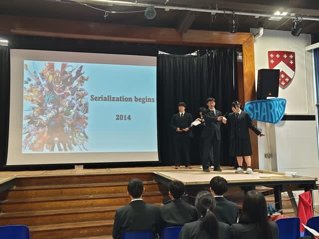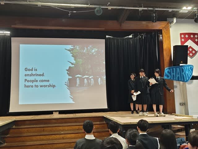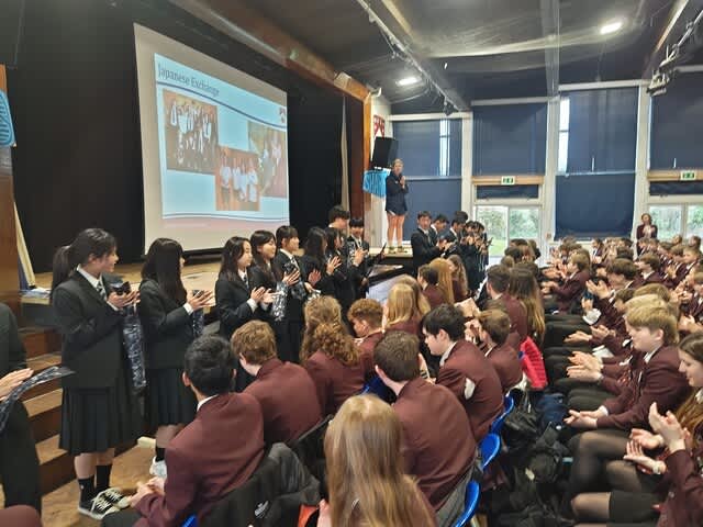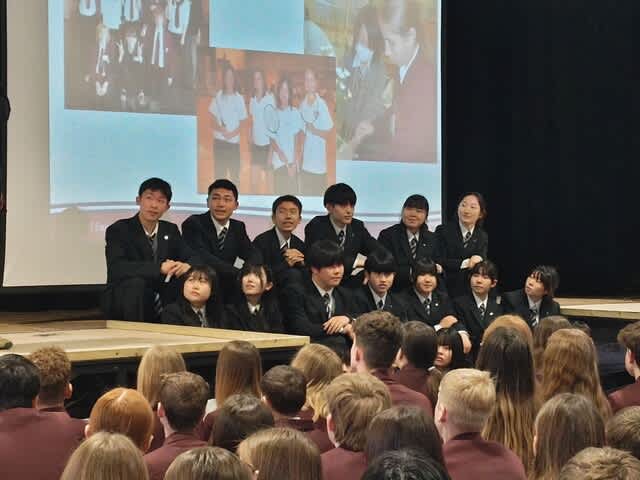 山梨県立日川高等学校 > 国際交流 > 令和5年度 英国語学研修 6日目 2024年3月21日カテゴリー: 国際交流 令和5年度 英国語学研修 6日目 3月20日(水) 英国語学研修6日目 昨日の放課後はパートナーと観劇に行ったり、ケーキを作ったり、 ショッピングをしたりして楽しむことができました。 しっかり睡眠も食事もとれています。 朝、ウェルカムセレモニーをドラマホールで行いました。 KLB校のYear9(13~14歳)の生徒が200名ほど参加し、 私達を歓迎してくれました。英語での自己紹介を行い、 KLB校から青色のネクタイを贈呈されました。 その後Civic Centreで英語研修を行いました。 午後の授業はYear8(12〜13歳)の生徒が35名に向けて、 日本文化(都市、観光、アニメ、伝統文化)および山梨県について、 それぞれが英語でのプレゼンテーションを行いました。 緊張している場面もありましたが、クイズなどを盛り込んで楽しく わかりやすく表現されていました。 KLB校生の中から日本を訪れたいと思ってくれる生徒が出てきてほしいと思いました。 KLBの先生方からも、「本当に素晴らしかった。よくできていた」 とお褒めの言葉をいただきました。 研修も残り半分です。学んできたことを生かして、 充実した研修にしていきたいと思います。
