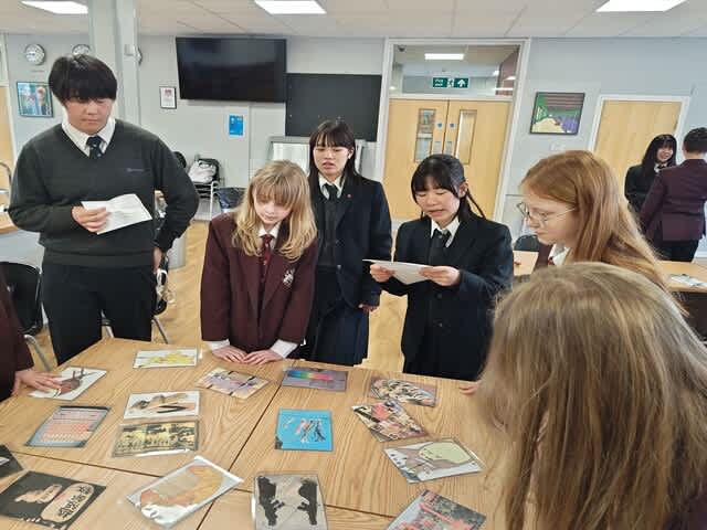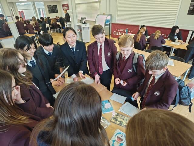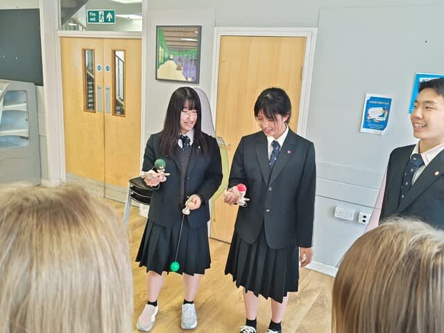 山梨県立日川高等学校 > 国際交流 > 令和5年度 英国語学研修 7日目 2024年3月22日カテゴリー: 国際交流 令和5年度 英国語学研修 7日目 3月21日(木) 英国語学研修7日目 英語研修・KLB校授業4日目 昨日はbirthday party に参加したり、サッカーの練習に参加したり、 お菓子作りをしたりして楽しみました。 自分で日本食を作ってホストファミリーに振舞った生徒もいました。 ホストファミリーとの生活も順調に進んでいます。 午前中はCivic Centre で3時間の英語研修です。 旅行の時の様々な表現方法や料理のレシピなど、 実際の生活に必要となる事柄を中心に学習しています。 こちらはアフタヌーンティーの時間・・・・・いや、 午前中のお茶の時間の様子です。朝の学習や仕事が一段落した頃に リフレッシュとしてお茶やお菓子を食べる習慣があるそうです。 ぜひ本格的なアフタヌーンティーも経験したいですね。 終了後KLB校に戻り、Year10(14~15歳)の生徒の日本語の授業に参加しました。 日本と英語の早口言葉をお互いにしゃべりあうとても楽しい時間でした。 午後はYear7(11~12歳)の生徒のJapaneseの授業に参加しました。 火曜日の授業と同じ流れでKLB生の自己紹介(日本語)と 3種類の日本の伝統文化(折り紙、カルタ、けん玉)を紹介しました。 2度目の紹介であり、英語に慣れてきたということもあり、 スムーズにわかりやすく、今まで以上にフレンドリーに、 どの生徒も生き生きと取り組むことができました。さすが日川高校生です。 KLB校の教室の一つに、日川高校が紹介されていました。 25年続く日川高校との関係を見ることができました。 これからも今まで以上に交流が深まってもらいたいと思います。