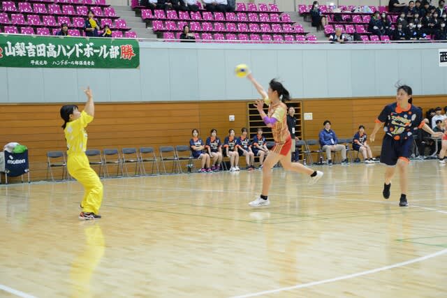 山梨県立日川高等学校 > 部活動 > 【2024高校総体】女子ハンドボール部 2024年5月13日カテゴリー: 部活動 【2024高校総体】女子ハンドボール部 女子ハンドボール部です。 高校総体2日目、準々決勝 甲陵高校と対戦しました。 34対11で勝利し、準決勝に進みます。 今日は、1・2年生の熱い応援もあり、選手も気合が入ります。