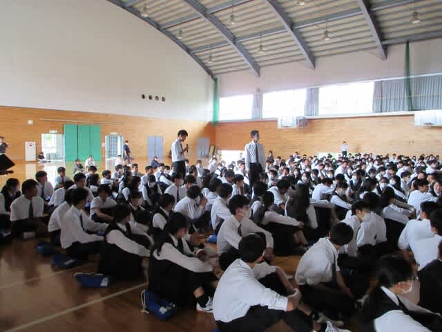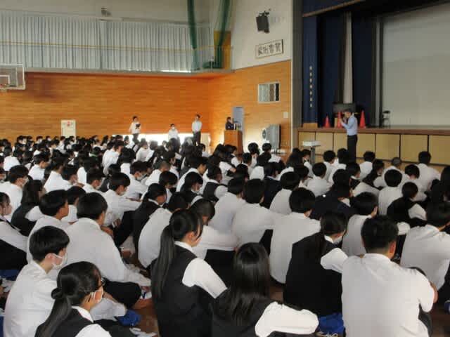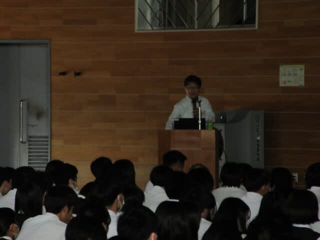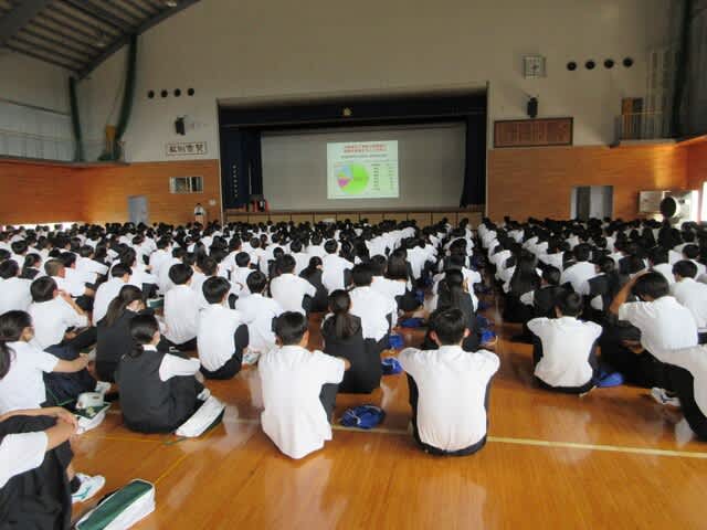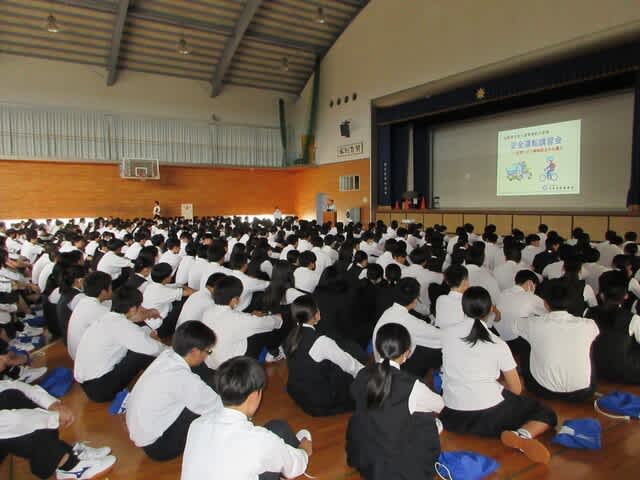 本日5月22日(水)体育館にて交通講話を実施し、 全校生徒で交通安全について学びました。 講師:日本自動車連盟 山梨支部 推進課事業係 高木 孝 様 演題:「交通安全講習会」 ~自転車ヘルメットの重要性・バイク運転時に注意すべきこと~ 動画や写真を多く使用した実践的な内容で、 特に生徒たちが日ごろ見ることができない 「自動車の運転手からの視点」の動画は、 講師の方の質問にも積極的答えていました。 ありがとうございました。