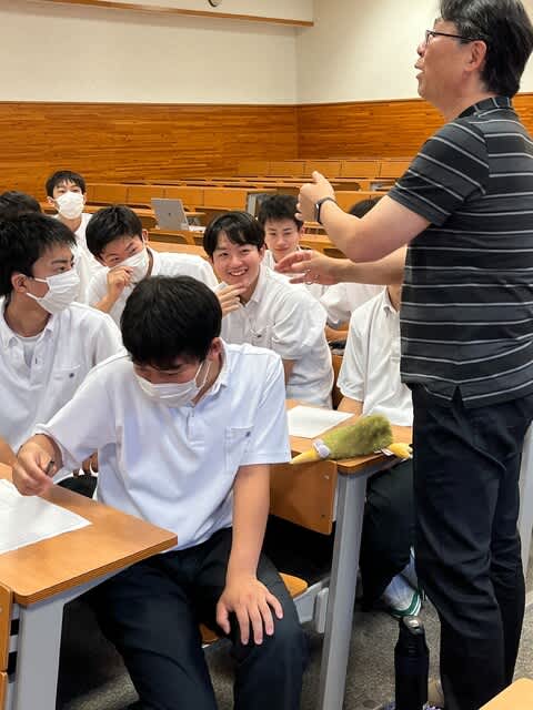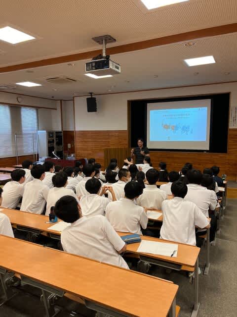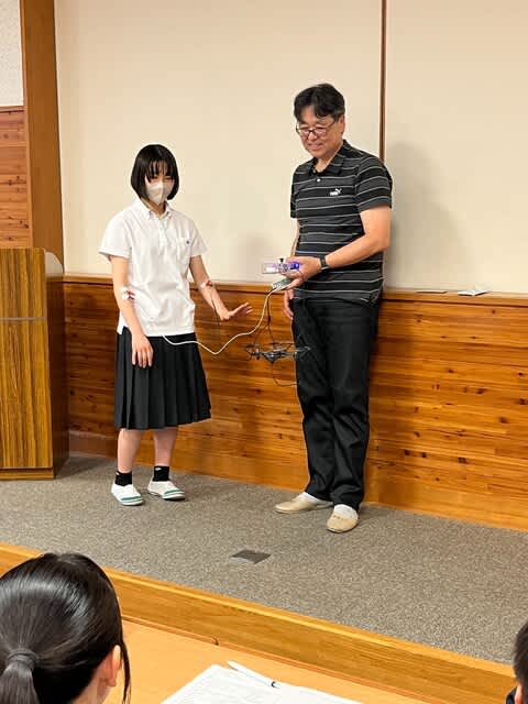 山梨県立日川高等学校 > SSH > 科学技術講演会① 2024年6月14日カテゴリー: SSH 科学技術講演会① 6月13日(木)に2年次SSHクラスを対象に科学技術講演会が行われました。 講師の先生は東京大学名誉教授であり、 東京大学先端科学技術研究センターシニアリサーチフェローを 務める神崎亮平先生です。 演題「昆虫の知能はAIを超えるか?〜自然と調和する新しい科学技術をつくる〜」 神崎先生の専門分野である生物学のみならず工学に関することまで興味深い話をしていただきました。 また、実験ではカイコガのフェロモンによる反応を見たり、 筋電位に反応して動くドローンを体験することができました。