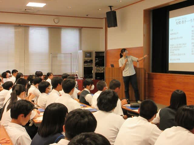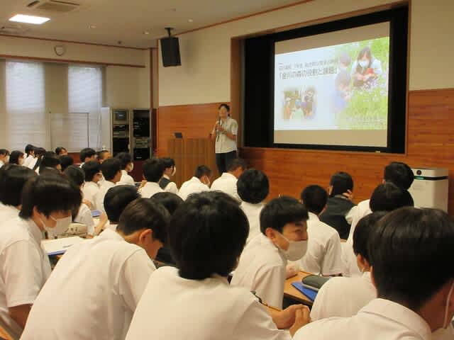 山梨県立日川高等学校 > SSH > SSⅠ「職業人と語る➃」 2024年6月17日カテゴリー: SSH SSⅠ「職業人と語る➃」 本日6月17日(月)視聴覚室に1年次を対象に専門分野の方々の お話を聞きました。 【講演①】 分野:自然 講師:山梨県森林公園金川の森 副園長 松橋 杏子 先生 「金川の森の役割と課題」 4本の柱をもとにお話ししていただきました。 ①質の高い森林環境育 ②峡東地区に賑わいを ③健康になれる森 ④保安林機能の推進 」 【講演②】 分野:技術 技術研究組合FCーCubic専務理事 小島 康一 先生 「山梨県と水素」 水素とは、どのように使かわれこれから次世代エネルギーについて 詳しくお話ししていただきました。 事例や動画を見ながらのお話しで生徒達は興味深く聞いていました。