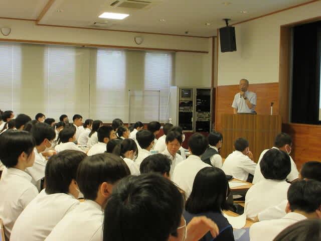 本日6月17日(月)視聴覚室に1年次を対象に専門分野の方々の お話を聞きました。 【講演①】 分野:自然 講師:山梨県森林公園金川の森 副園長 松橋 杏子 先生 「金川の森の役割と課題」 4本の柱をもとにお話ししていただきました。 ①質の高い森林環境育 ②峡東地区に賑わいを ③健康になれる森 ④保安林機能の推進 」 【講演②】 分野:技術 技術研究組合FCーCubic専務理事 小島 康一 先生 「山梨県と水素」 水素とは、どのように使かわれこれから次世代エネルギーについて 詳しくお話ししていただきました。 事例や動画を見ながらのお話しで生徒達は興味深く聞いていました。