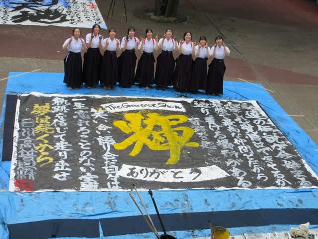 ★文化局発表・放送部 各部活動試合のダイジェスト版でみんな盛り上がっていました。 ★1年次クラス発表(PRビデオ・合唱) *1-1 *1-4 *1-5 *1-2 *1-3 会場盛り上がりました。 練習の成果を出して頑張っていました。 ★書道部発表 ★3年次 模擬店 どのお店も長列で大賑わいです。 午後からも・有志発表・2年次クラス発表があります。 体調管理をして頑張っていきましょう!
