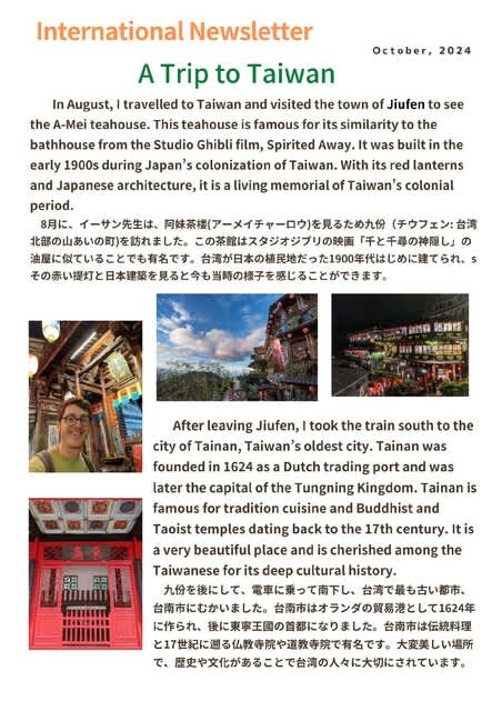 山梨県立日川高等学校 > 国際交流 > 国際教育通信 10月号 2024年10月8日カテゴリー: 国際交流 国際教育通信 10月号 10月より国際教育通信を再開します。 今回はイーサン先生の台湾旅行記をお伝えします。