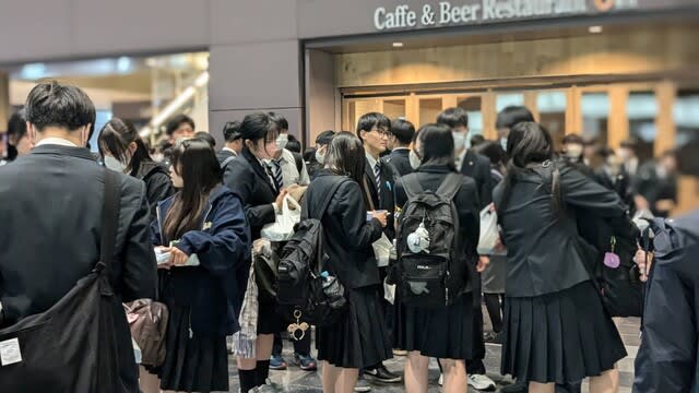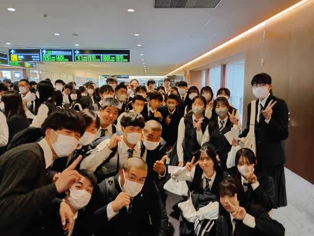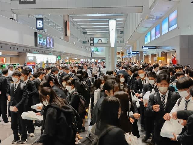 山梨県立日川高等学校 > 行事 > 修学旅行 > 令和6年度修学旅行(羽田空港) 2024年11月12日カテゴリー: 修学旅行 令和6年度修学旅行(羽田空港) 交通渋滞のため予定より少し遅れての到着となりましたが、羽田空港に到着しました。 今から保安検査に向かいます。