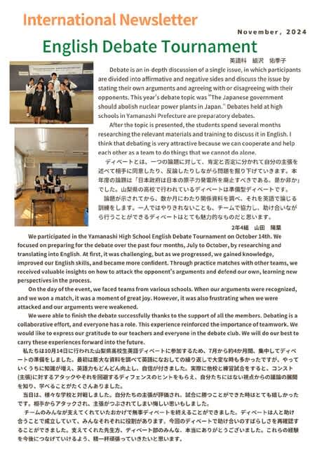 山梨県立日川高等学校 > 国際交流 > 国際教育通信 International Newsletter November, 2024 2024年11月22日カテゴリー: 国際交流 国際教育通信 International Newsletter November, 2024 英語ディベート大会に参加した様子をお伝えします。