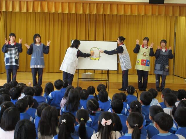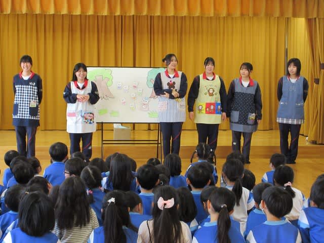 3年文系選択:子どもの発達と保育の授業で風の子保育園にきた様子です。 7回ある実習の7回目で、今までのお礼をこめて、 パネルシアター、クイズ、手遊びなどの発表をしました。 園児達は大きな声で一緒に参加してくれました。 発表会のあと園児一緒に遊びました。園児のパワーに圧倒されました。 ありがとうございました。