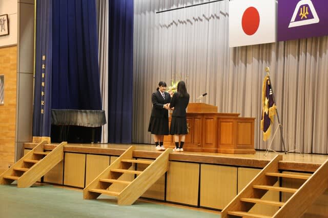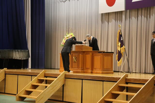 山梨県立日川高等学校 > 行事 > 令和6度 表彰式及び記念品贈呈式 2025年2月28日カテゴリー: 行事 令和6度 表彰式及び記念品贈呈式 本日2月28日(金)表彰式と記念品贈呈式が行われました。 ★生徒会功労賞179名 ★外郭団体表彰 『山梨県高等学校体育連盟 特別表彰』 ・ウエイトリフティング部 運動部23名、文化部13名が表彰されました。 ★第43回黒澤亮平奨励賞では『スポーツ奨励賞14名』『文武両道奨励賞10名』 が表彰されました。 (本校同窓生で高校6回卒の黒澤建設株式会社代表取締役、黒澤亮平様のご厚意により 在学中スポーツ部門・文化部門において優秀な成績をおさめた個人、文武両道を実践したもの、 さらに地域社会に勇気や感動を与えた個人・団体が表彰されます) 常務取締役技術部長 平井 圭様よりメダルと激励のお言葉をいただきました。 ★お礼の言葉 生徒代表 平塚 麗桜 ★第6回齊藤寛賞(本校同窓生で高校第4回卒の株式会社シャトレーゼホールディングス代表取締役会長齊藤寛様の ご厚意により、在学中各種活動において優秀な成績をおさめた個人が表彰されます。) 文武両道賞として5名、体育的活動表彰43名、文化的活動表彰24名が表彰されました。 ★校長挨拶 ★記念品贈呈 『卒業生から学校へ』 大型液晶テレビ2台寄付していただきました。 大切に使わせていただきます。 ★『在校生から卒業生へ』 マグカップをいただきました。