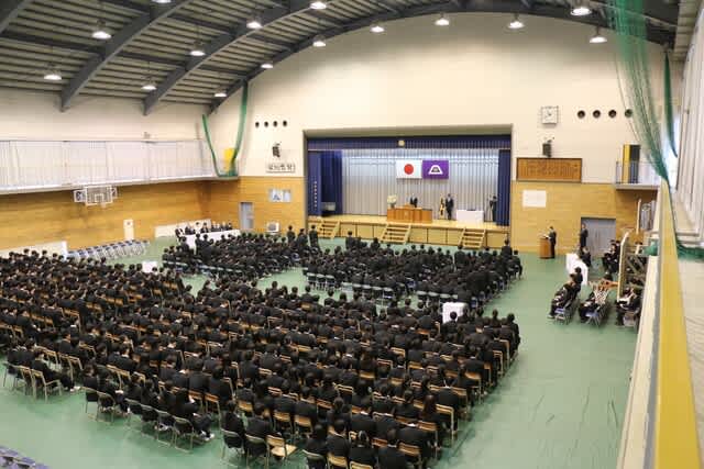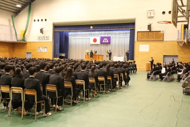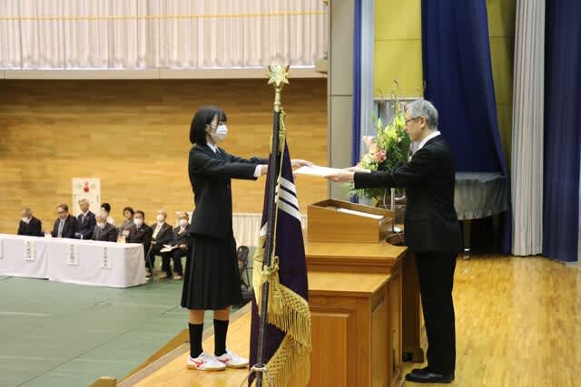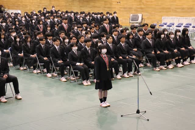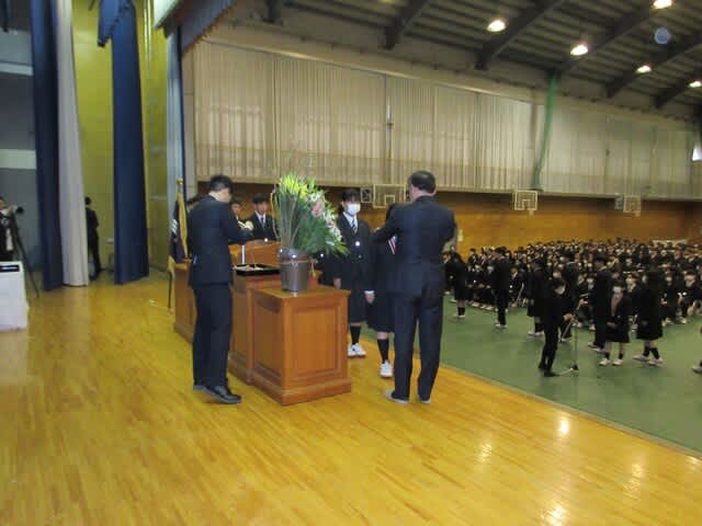 本日2月28日(金)表彰式と記念品贈呈式が行われました。 ★生徒会功労賞179名 ★外郭団体表彰 『山梨県高等学校体育連盟 特別表彰』 ・ウエイトリフティング部 運動部23名、文化部13名が表彰されました。 ★第43回黒澤亮平奨励賞では『スポーツ奨励賞14名』『文武両道奨励賞10名』 が表彰されました。 (本校同窓生で高校6回卒の黒澤建設株式会社代表取締役、黒澤亮平様のご厚意により 在学中スポーツ部門・文化部門において優秀な成績をおさめた個人、文武両道を実践したもの、 さらに地域社会に勇気や感動を与えた個人・団体が表彰されます) 常務取締役技術部長 平井 圭様よりメダルと激励のお言葉をいただきました。 ★お礼の言葉 生徒代表 平塚 麗桜 ★第6回齊藤寛賞(本校同窓生で高校第4回卒の株式会社シャトレーゼホールディングス代表取締役会長齊藤寛様の ご厚意により、在学中各種活動において優秀な成績をおさめた個人が表彰されます。) 文武両道賞として5名、体育的活動表彰43名、文化的活動表彰24名が表彰されました。 ★校長挨拶 ★記念品贈呈 『卒業生から学校へ』 大型液晶テレビ2台寄付していただきました。 大切に使わせていただきます。 ★『在校生から卒業生へ』 マグカップをいただきました。
