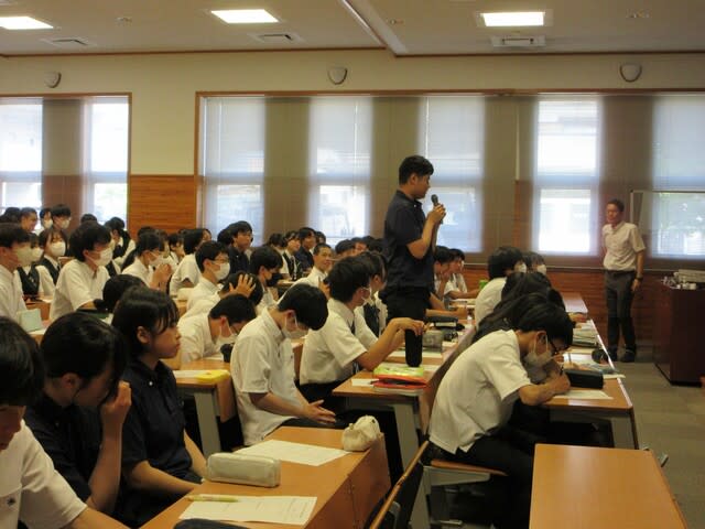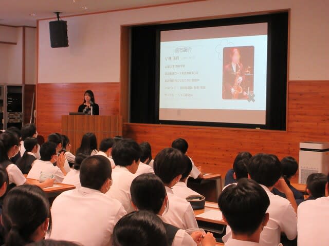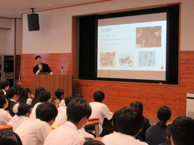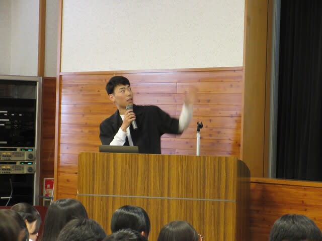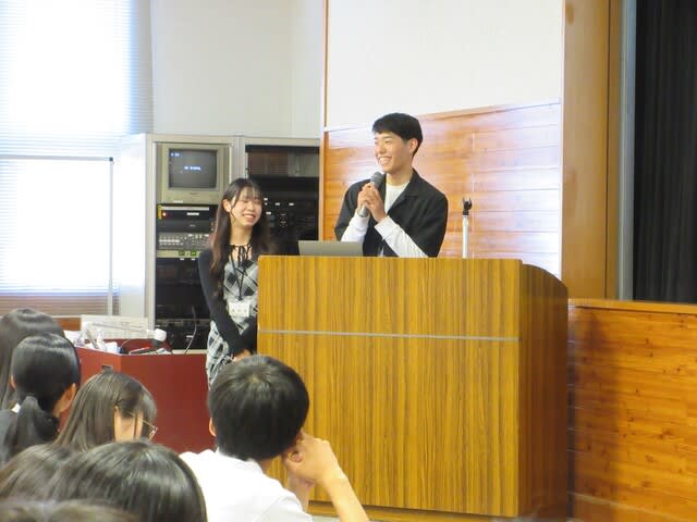 山梨県立日川高等学校 > 日記 > SS Ⅱ第1回OB講話 2025年5月21日カテゴリー: 日記 SS Ⅱ第1回OB講話 5月20日(火)2年次を対象とした進路研究の一環として視聴覚室にて OB大学生の学んでいることや研究していること また経験に基づいた話ししていただきました。 ★小林 美月 さん 『山梨大学教育学部言語教育コース英語教育科3年』 ★古屋 将洋 さん 『山梨大学生命環境学部環境科学科3年』 先輩の経験に基づいた話なので分かりやすく 質疑応答も活発に行っていました。 ありがとうございました。