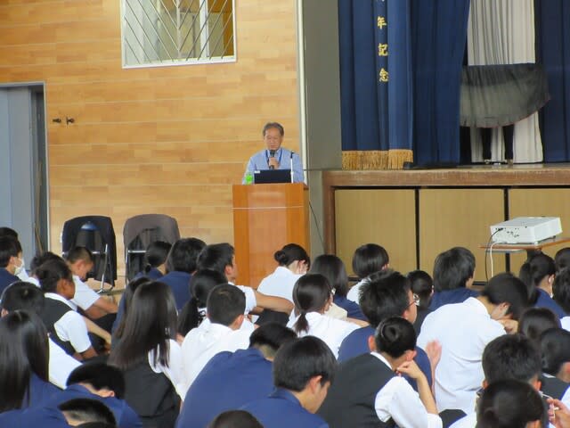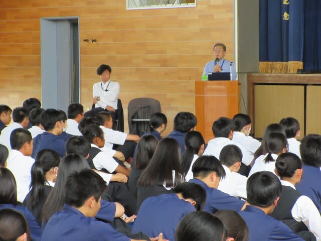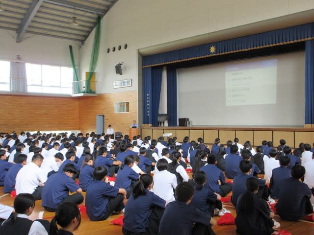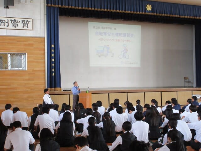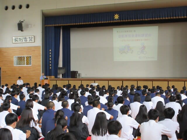 山梨県立日川高等学校 > 日記 > 令和7年度 交通講話 2025年5月23日カテゴリー: 日記 令和7年度 交通講話 5月21日(水)体育館にて交通講話を実施し、 全校生徒で交通安全について学びました。 講師:日本自動車連盟 山梨支部 推進課事業係 三枝 成己 様 演題:「交通安全講習会」 ~自転車ヘルメットの重要性・バイク運転時に注意すべきこと~ 動画や写真を多く使用した実践的な内容で、 特に生徒たちが日ごろ見ることができない 「自動車の運転手からの視点」の動画は、 今後の本校生徒の交通安全に役立つものになると感じました。 ありがとうございました。