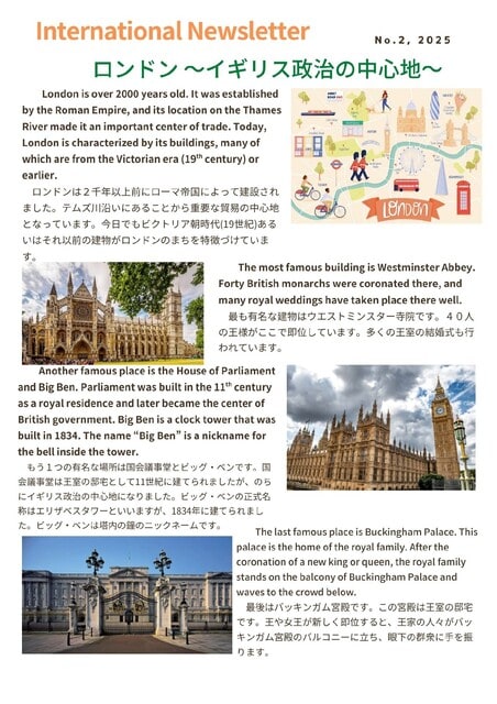 山梨県立日川高等学校 > 国際交流 > 国際教育通信 International Newsletter No.2, 2025 2025年6月3日カテゴリー: 国際交流 国際教育通信 International Newsletter No.2, 2025 ロンドン中心部の有名な場所を紹介します。何回かにわたってイギリス特集をします。