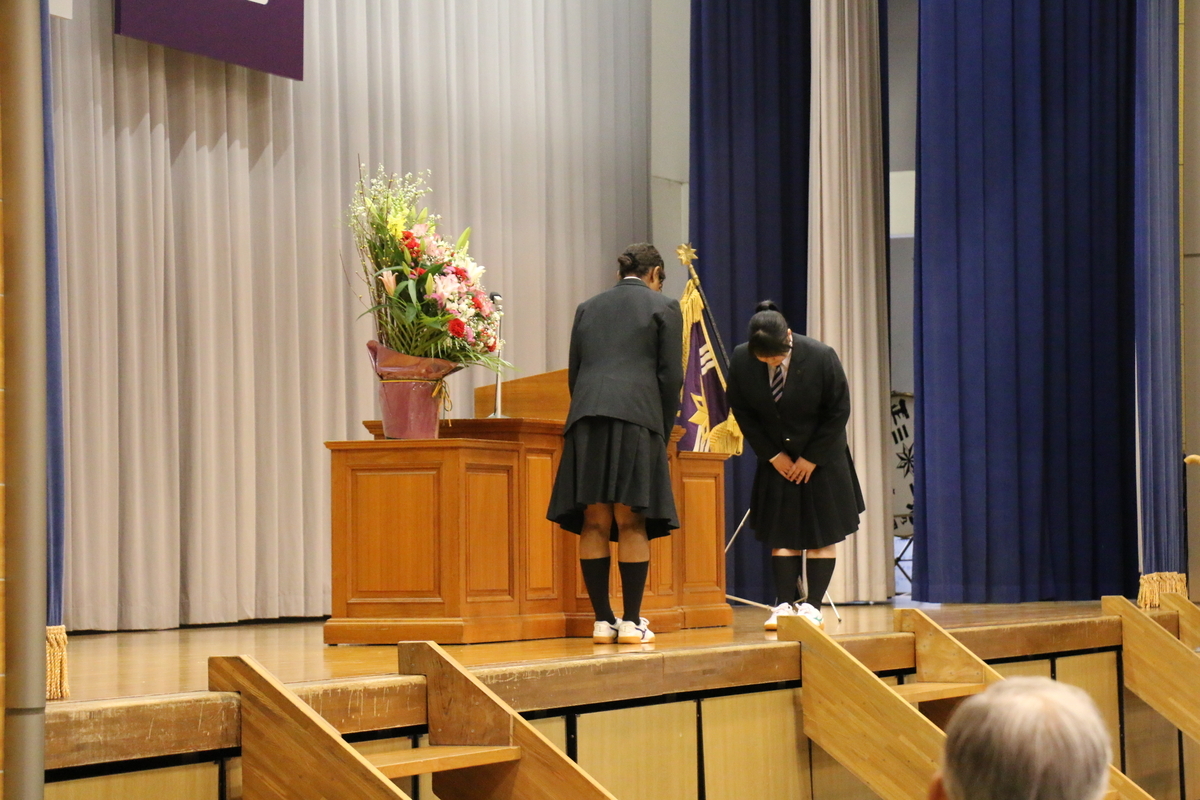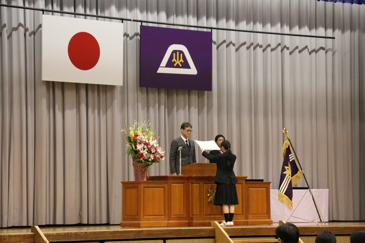 山梨県立日川高等学校 > 行事 > 令和7度 表彰式及び記念品贈呈式 2026年2月27日カテゴリー: 行事 令和7度 表彰式及び記念品贈呈式 2月27日(金)表彰式と記念品贈呈式が行われました。 ★生徒会功労賞167名 『山梨県高等学校体育連盟 特別表彰』 *団体表彰 ウエイトリフティング部 女子 *個人表彰 ウエイトリフティング部 6名 各協会・連盟からも39名が表彰されました。 ★第44回黒澤亮平奨励賞では『スポーツ奨励賞9名』『文化奨励賞1名』『文武両道奨励賞8名』が表彰されました。 (本校同窓生で高校6回卒の黒澤建設株式会社代表取締役、黒澤亮平様のご厚意により在学中スポーツ部門・文化部門において優秀な成績をおさめた個人、文武両道を実践したもの、さらに地域社会に勇気や感動を与えた個人・団体が表彰されます) 常務取締役技術部長 平井 圭様よりメダルと激励のお言葉をいただきました。 ★第7回齊藤寛賞 (本校同窓生で高校第4回卒の株式会社シャトレーゼホールディングス創業者である 故 斉藤寛様のご厚意により、在校生、各種活動において優秀な成績をおさめた個人を表彰するものです。) 『文武両道賞5名』『体育的活動表彰8名』『文化的活動表彰21名』が表彰されました。 ★記念品贈呈 『卒業生から学校へ』 横断幕が送られました。 大切に使わせていただきます。 ★『在校生から卒業生へ』 マグカップが送られました。